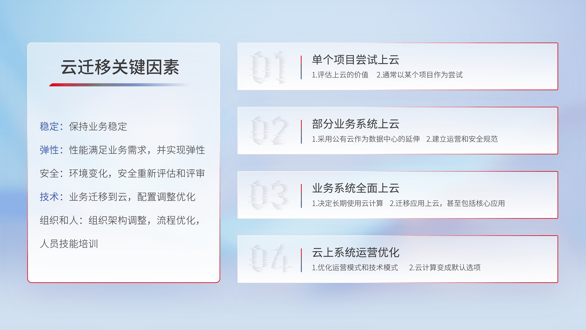 结合实际业务,,从规划设计、、云平台选型、、、云原生改造、、、数据迁移、、、集成交付,,,,迁移全过程为客户识别最佳上云路径,,,,做好风险识别管理,,设计网络架构、、身份权限、、、、安全审计合规、、操作审计、、日志审计、、、、监控告警策略、、、、多站点容灾设计等,,对云上基础设施进行整体规划,,提升IT治理水平,,以满足弹性、、、、高可用、、高性能的需求。。。。